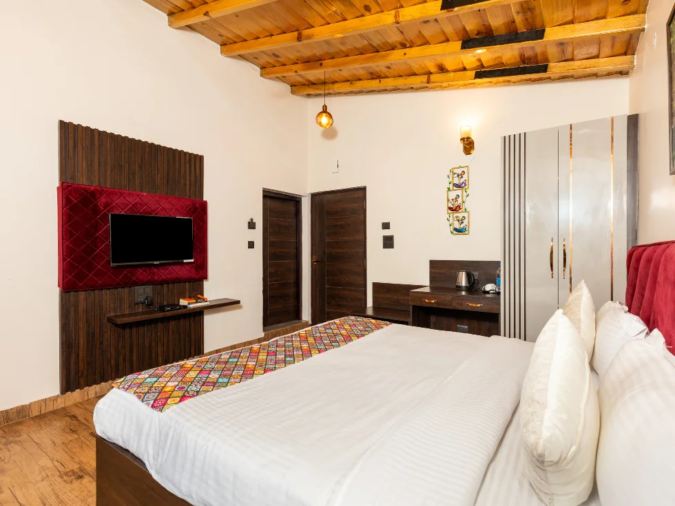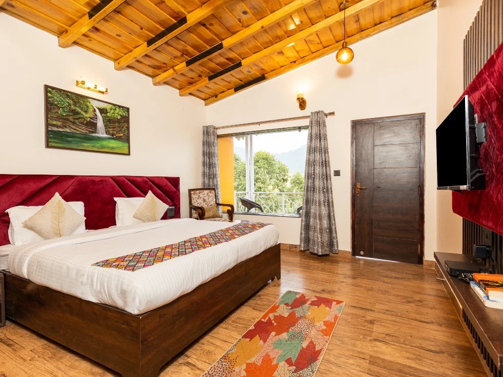 Experience vibrant tranquility in The Lively Red Theme Rooms, perfect for your calm and refreshing vacation in Mukteshwar.