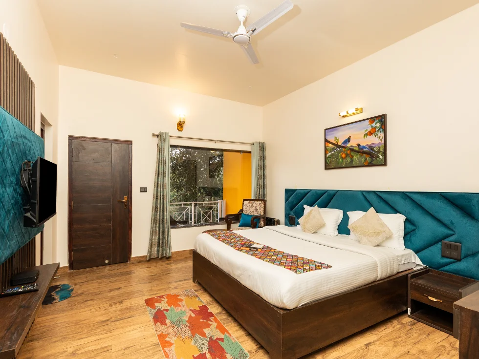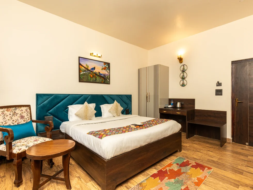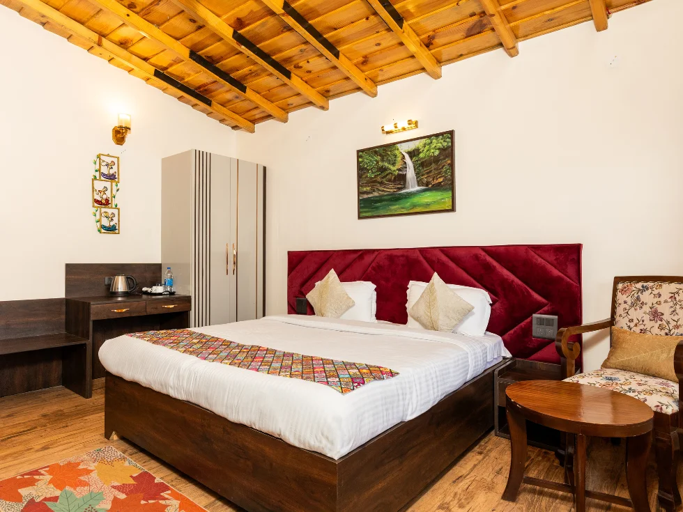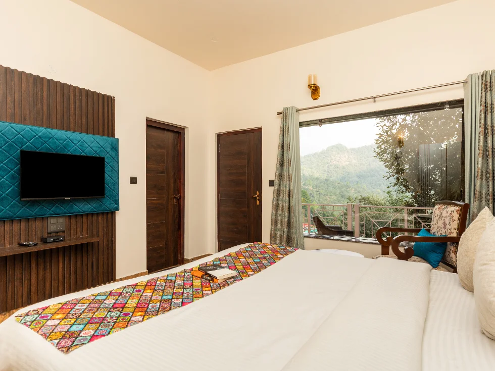 Discover elegance in the Pine Superior Room category, a perfect blend of modern English architecture for a serene and luxurious stay in Mukteshwar.